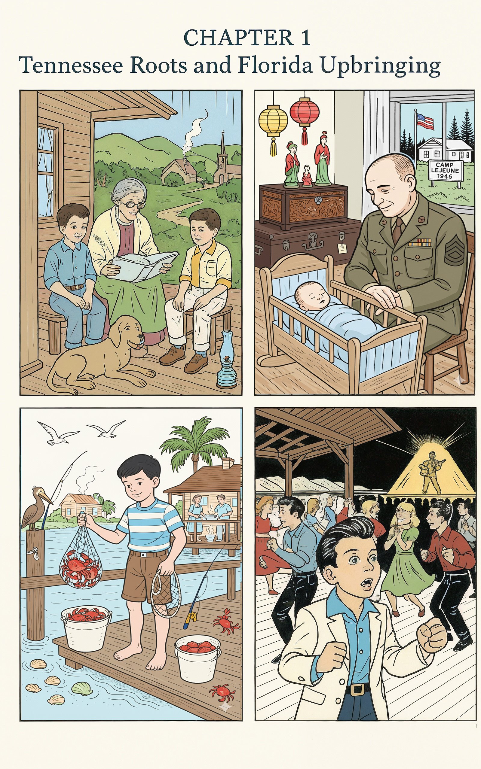 It was in Panama City that I discovered Elvis and rock ânâ roll. I was nine years old, dressed like him in hand-me-downs cut to fit the style. My sister Trudy and I sang Everly Brothers harmonies together. For me, the music was freedom, rebellion in a voice that shook the walls. I wasnât just watching Elvis; I was trying to be him. My older cousin from Tennessee, who stayed with us some summers, would sneak me into shows in Panama City Beach. I lived for the lights, the screams of teenage girls. I was only nine, but I felt sixteen. The concerts were noise and possibility â a door cracked open onto another world.