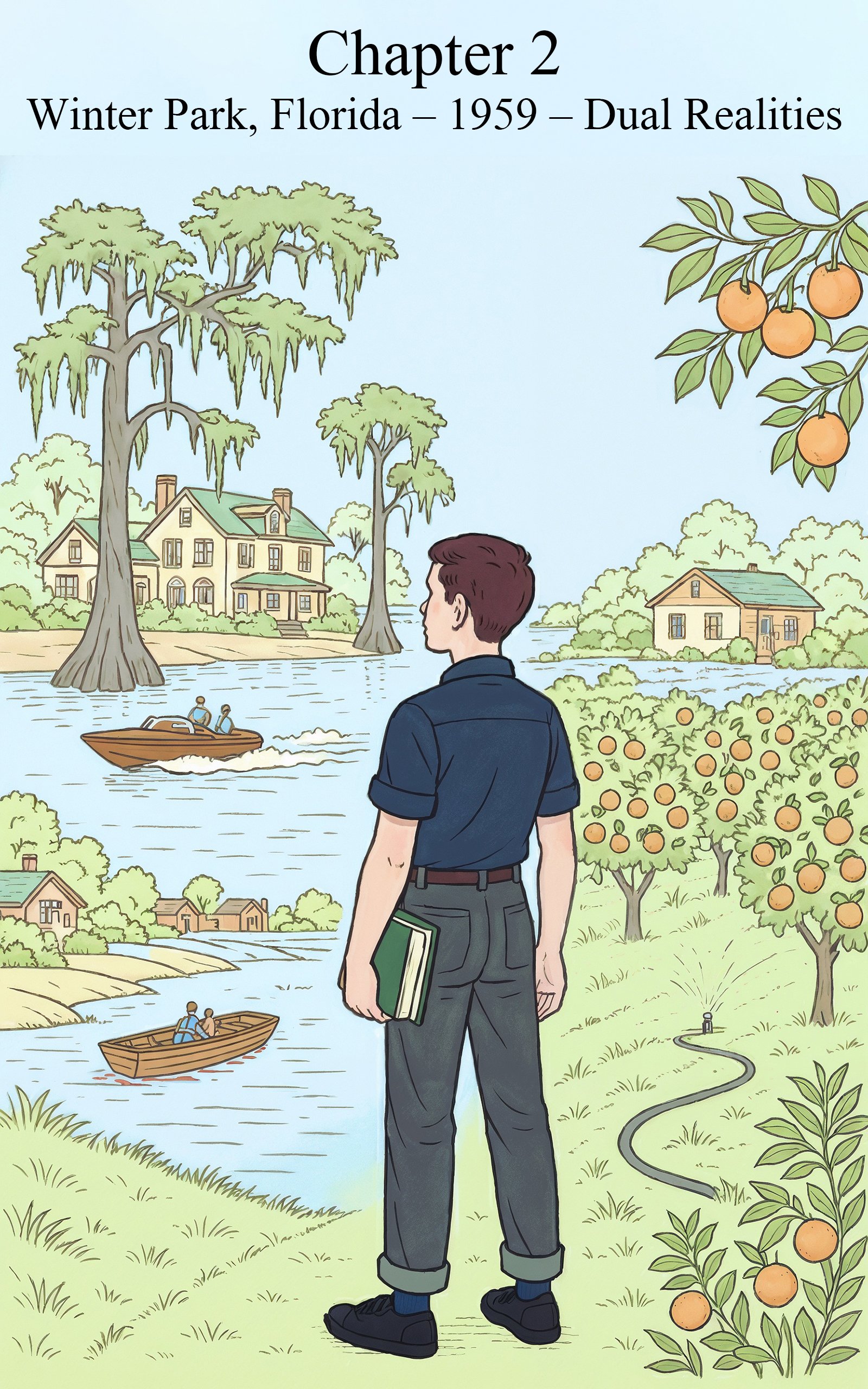 After Panama City, we moved again, this time to Winter Park. The town had two faces. One belonged to the canals lined with moss-draped cypress and grand lake houses whose screened porches opened onto the water. Ski boats traced lazy figure eights across the connected lakes where old money lived, their wakes rolling toward manicured lawns that smelled faintly of jasmine and cut grass. The other face was ours â the modest subdivision carved out of the orange groves, where the air was thick with fertilizer and the hum of cicadas. The nights carried the scent of blossoms, the steady hiss of sprinklers turning rhythmically over clipped lawns, and the soft rustle of palmetto fronds against the windows.